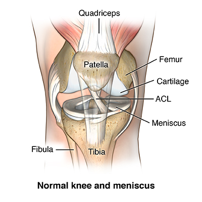 There are 3 bones in the knee. These are the femur, tibia, and patella. The ends of those bones are covered with cartilage. This is a smooth material that cushions the bone and allows the joint to move easily without pain. The cartilage acts as a shock absorber. Between the bones of the knees are 2 crescent-shaped disks of connective tissue, called menisci. These also act as shock absorbers to cushion the lower part of the leg from the weight of the rest of the body.
